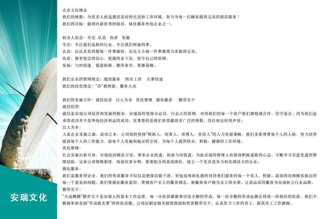安瑞環(huán)境正以“創(chuàng)建經營規(guī)模化、樹立服務多元化、營造管理現(xiàn)代化”為發(fā)展戰(zhàn)略,堅持“立足長遠、精誠合作、技術創(chuàng)新、質量為本、優(yōu)質服務”的經營方針,力爭打造成為國內具有影響力的現(xiàn)代化環(huán)境衛(wèi)生綜合性的服務企業(yè)。